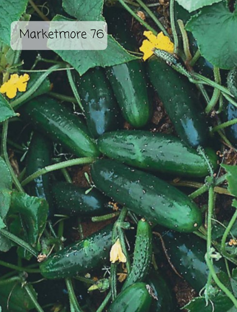 Marketmore 76 – 60 days. A reliable good flavoured variety that produces abundant yields of 8-9” slicers on disease resistant plants.