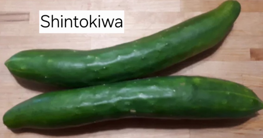 Shintokiwa – 62 days. Japanese long, slender, smooth skinned fruits, averaging 9–10″ and growing up to an edible size of 1′ in good fertility. Sweet, crisp and juicy without bitterness. Trellis plants for really straight fruit & harvest when slender for best flavour & texture. Good for pickles too.