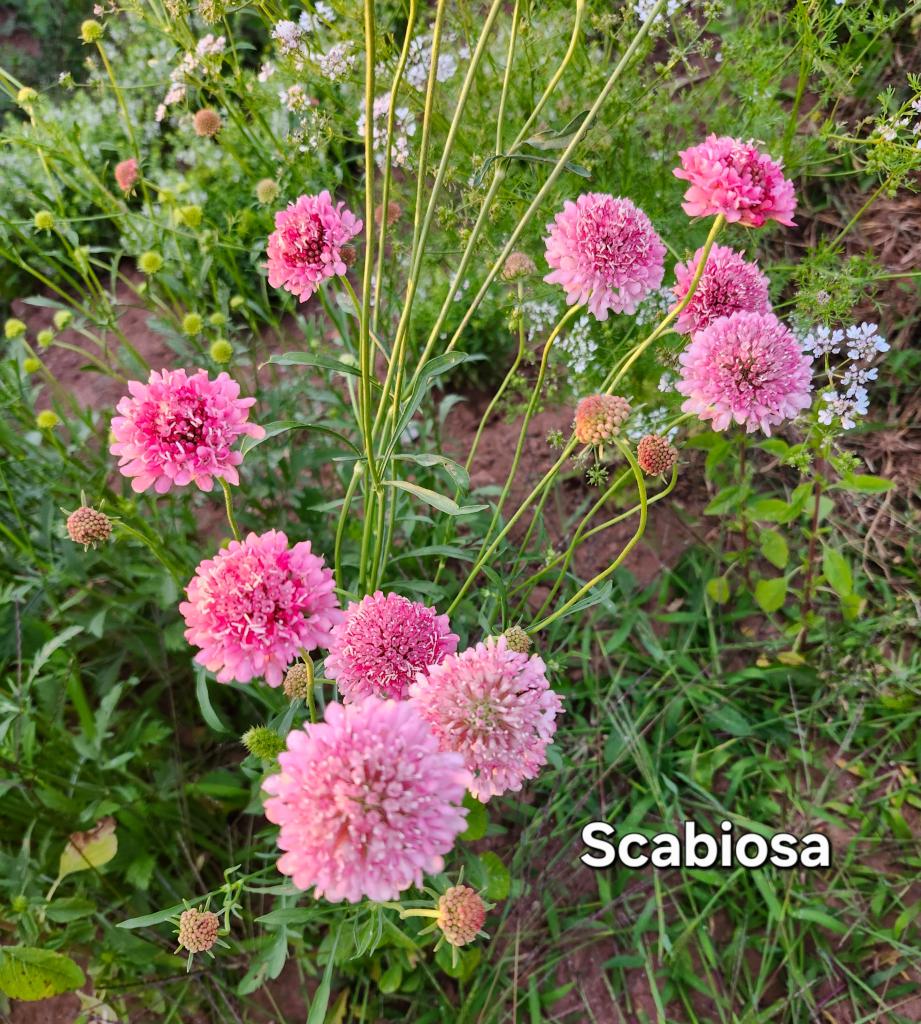 1) Formula Mixture – Charming, low maintenance, long lasting cut flower for fresh blooms & seed pods on long wiry stems for dried flower arrangements. Blooming in shades of soft pinks, blues & purple, the delicate blossoms resemble pin cushions atop slender stems. These graceful plants are highly attractive to pollinators & provide a long season of blooms