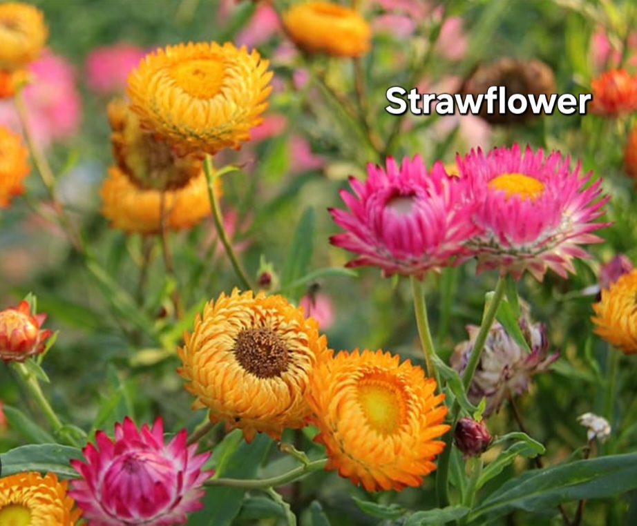 1) Strawflower Mix Vibrant, enchanting, long-lasting papery blooms in reds, yellows, pinks, orange, whites & bi-colours. These easy to grow annuals thrive in full sun & heat, attracting pollinators & providing colour & interest to your garden all season long until frost. Best harvested before fully open for dried flower arrangements.