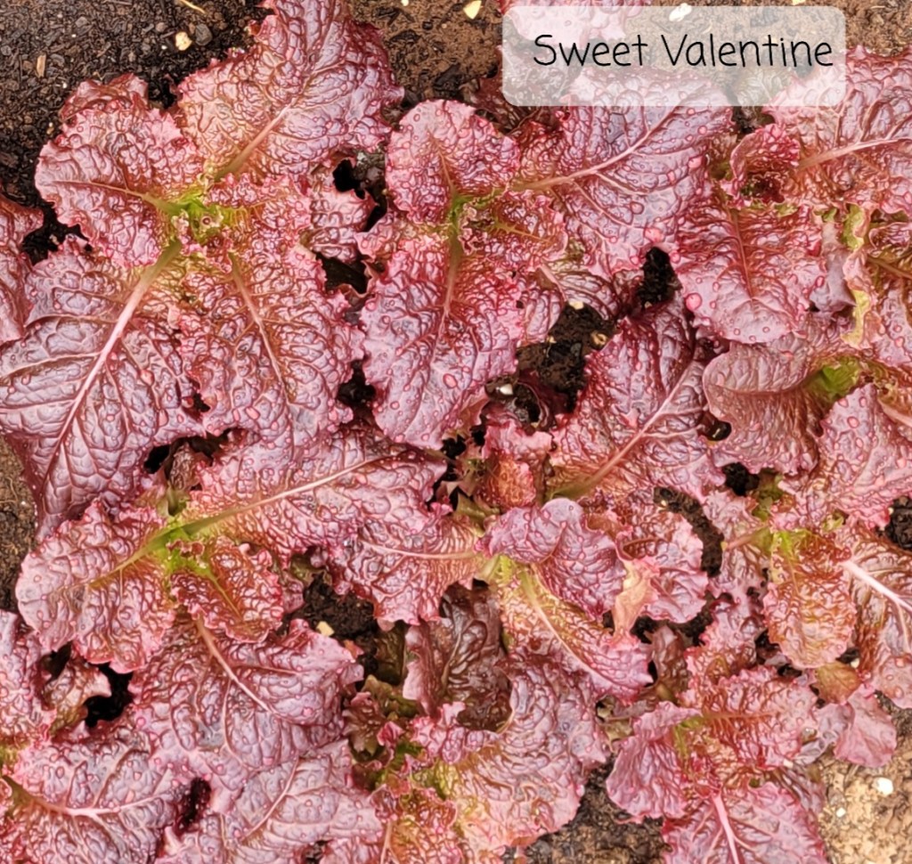 Sweet Valentine – 55 days. A real sweetheart of a lettuce, Valentine combines magnificent beauty with mild sweet taste. Beginning as a large spreading bronzed butterhead with rounded veined leaves, it matures into a romaine shape. Slow to bolt even in hot dry conditions. Flavour is more delicate, soothing and less bitter before it assumes romaine configuration. The extremely deep-red leaves are slightly smaller than other cos varieties.